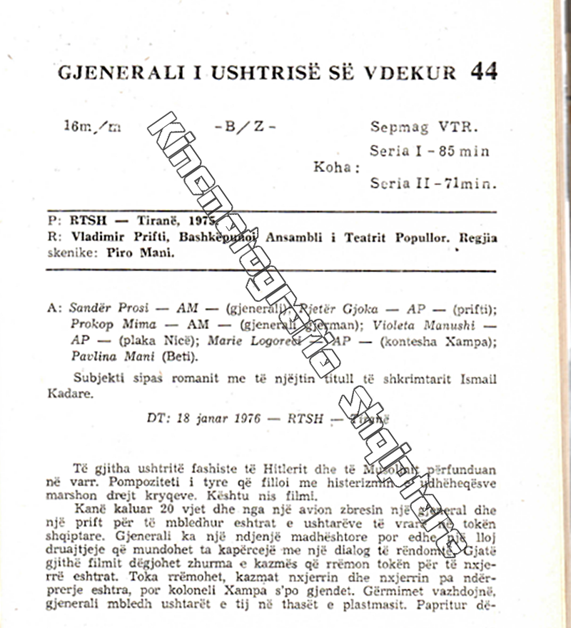 January 17, 2022, coincides with the 47th anniversary of the first showing of the TV movie "The General of the Dead Army", the first version, RTSH of 1976. Director: Vladimir Prifti. The People's Theater Ensemble collaborated. Stage direction: Pirro Mani