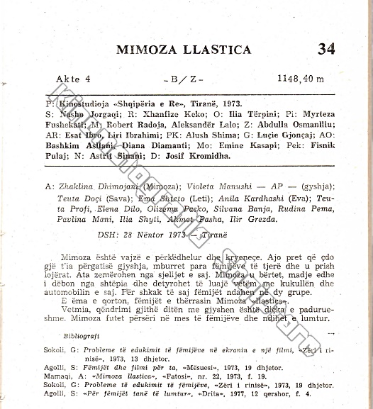 In the center of the film is Mimoza, a stubborn and pampered little girl who lives in the midst of excessive care. Mimosa has her grandmother always available. Mimosa constantly kicks her friends out of the house and her friends spoil all their toys until she is left alone and regretful with only the doll. Isolated by loneliness and by the envy of seeing the other friends all together, she tried to destroy this group of friends, but one day a mason who worked near the girls’ palace understood the girl’s behavior and with his sweet speech managed to convince and advise the girl to be tolerant and simple. The girl realized the mistake and joined her friends and changed a lot.